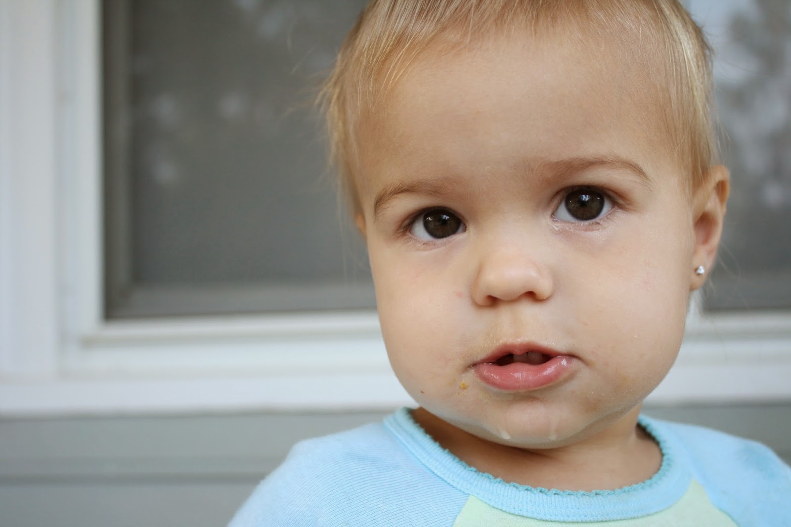 She still babbles a lot, but has several words! Mama, 'dake' (Drake, the dog), no no!, 'hee-i-cah-uh' (helicopter), Dada, 'nack' (snack), thank you, hat ('at' while rubbing her head), nose, eyes, night night (nigh nigh) and probably some I can't remember.